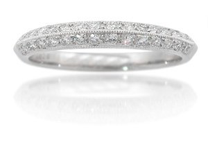 This beautiful antique style platinum knife edge wedding band ring, features 28 round brilliant cut white diamonds, pave set, of F color, VS2 clarity, of excellent cut and brilliance, weighing cheap wedding rings