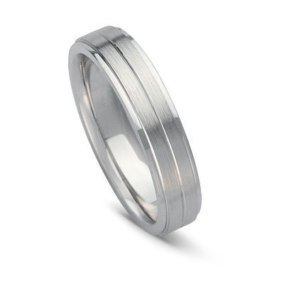 A 5mm satin-finished platinum comfort fit mens wedding band with highly polished cut-grooves in the center & sides----- an attractive symbol of love. Weight of ring varies from 12.08 grams to 17.34 grams. Scroll Below to view gram weight of Individual sizes