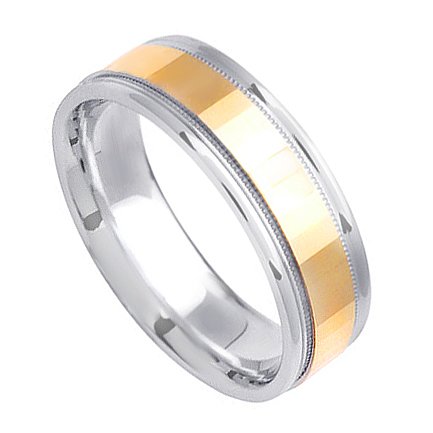 A stylish, classy band, it is beautifully crafted from platinum and yellow gold.This ring is measured in 6.00mm width and 2mm thick approximate.The Wedding Ring is comfort fitted so the ring feels more comfortable.Center is 18K yellow gold with shiny finish, with milgrain on each side and both sides of the ring is platinum with shiny finish.